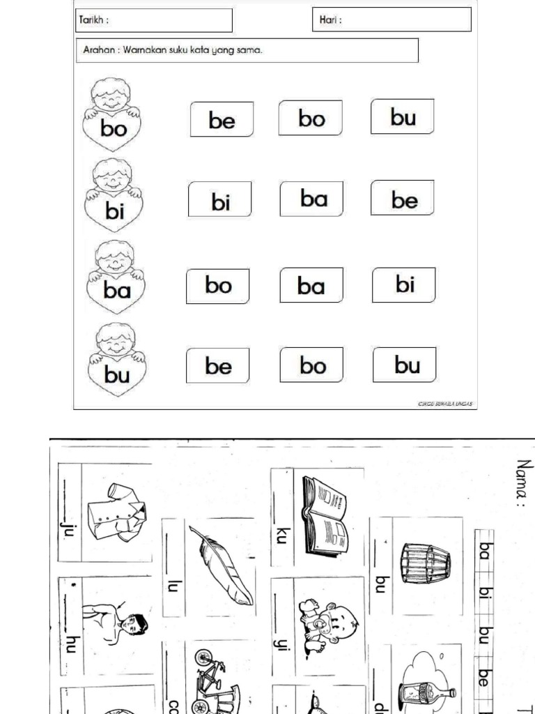 Suku Kata Kv Huruf B Language Malay Grade Level Kg School Subject Bahasa Melayu Bm Main Content Suku Kata Elementary Learning Worksheets Preschool Colors